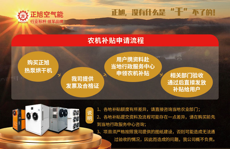 值得一提的是,正旭5HG-32R、5HG-55R、5HG-80R、5HGKB-90A四款果蔬烘干機成功進入安徽、甘肅、廣西、貴州、海南、河北、河南、湖北、吉林、江蘇、江西、遼寧、寧夏、青海、山東、山西、陜西、四川、新疆(含新建建設兵團)、云南、浙江、重慶22個省市自治區農機補貼目錄,使用正旭熱泵烘干機最高可享受9500元農機補貼款,這已是正旭連續多年進入各地農機補貼目錄。