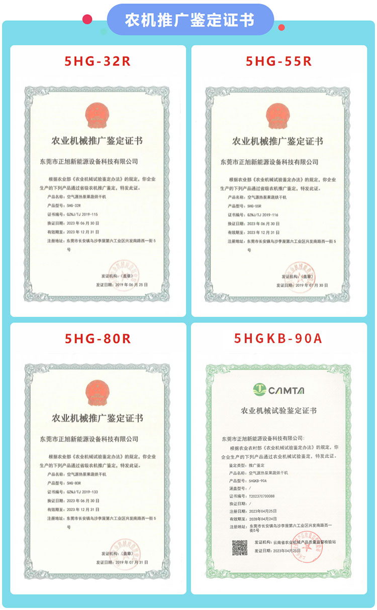 經貴州及云南兩省農業機械質量鑒定部門對正旭4款果蔬烘干機的容積、功率、干燥能力等參數嚴格檢測顯示:正旭5HG-32R、5HG-55R、5HG-80R和5HGKB-90A四款機型均符合DG52/T 030 -2017《果蔬烘干機》的要求,推廣鑒定結論為通過,并頒發農機推廣鑒定證書。